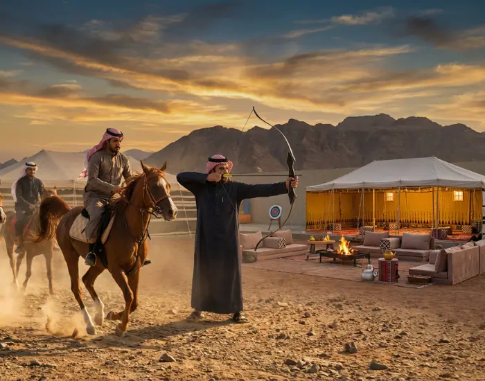 We specialize in authentic cultural and outdoor adventures in Madinah, including guided horseback riding, traditional archery, horseback archery lessons, and private "Istiraha" (lounge) gatherings with stunning views of Mount Uhud.